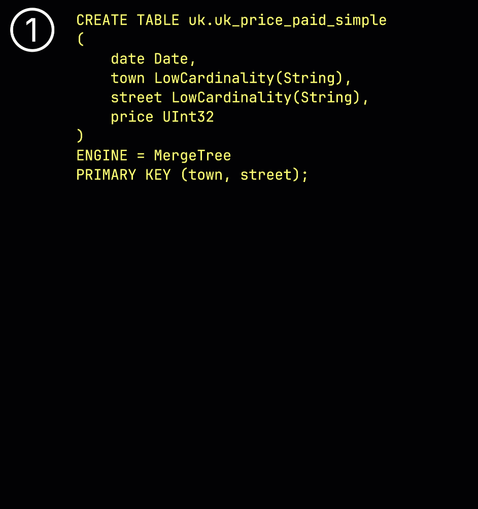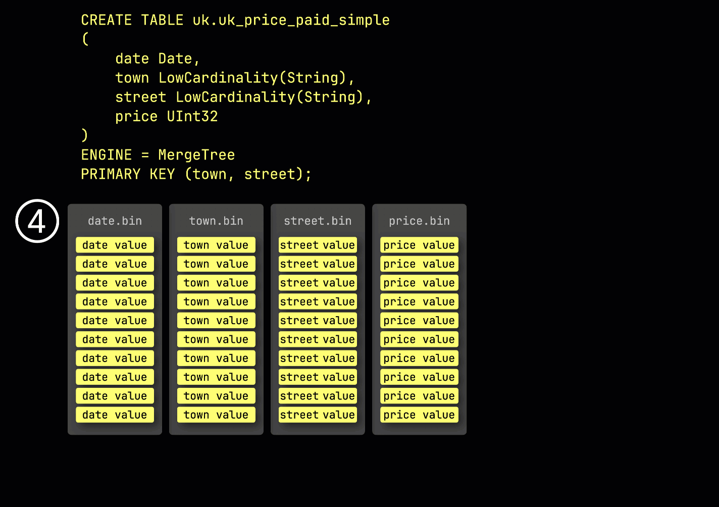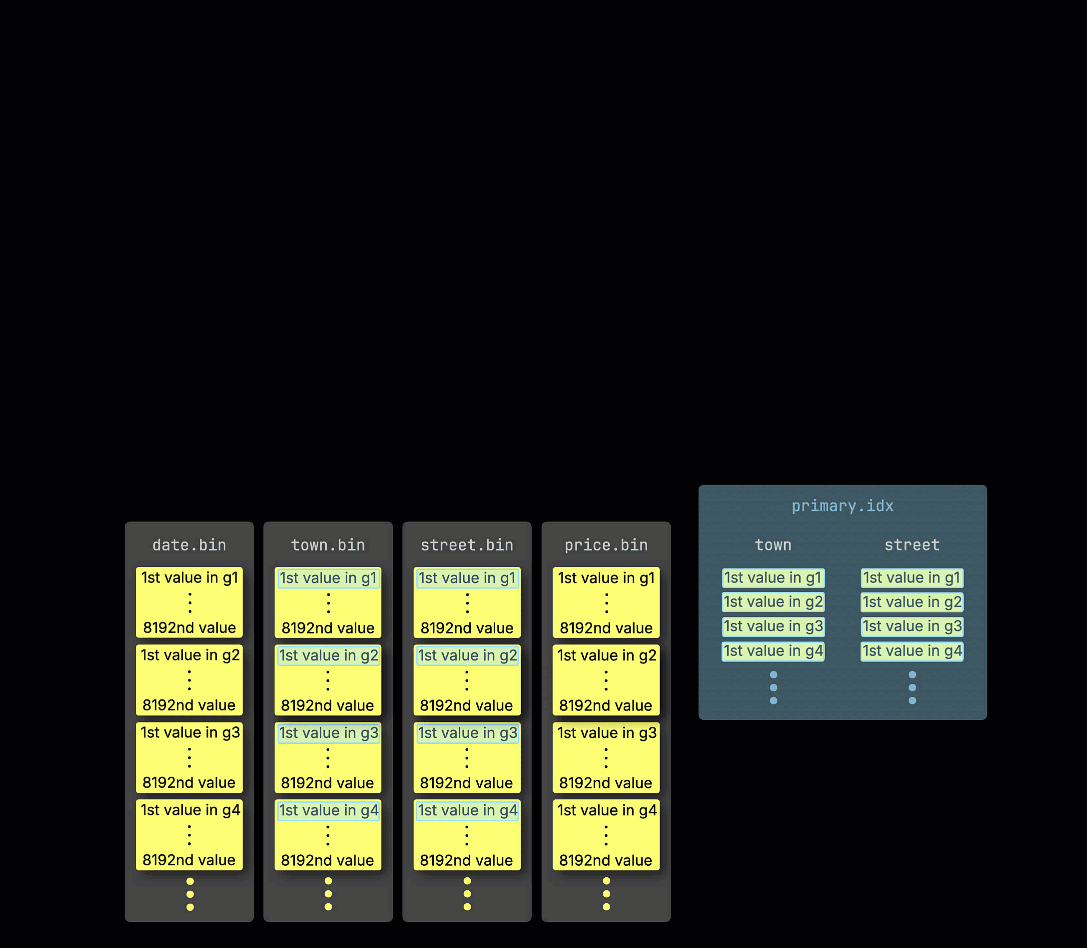 Как напоминание: в нашей ① примерной таблице с ^^первичным ключом^^ (town, street) ② вставленные данные ③ сохраняются на диске, отсортированными по значениям столбцов ^^первичного ключа^^ и сжатыми, в отдельных файлах для каждого столбца: